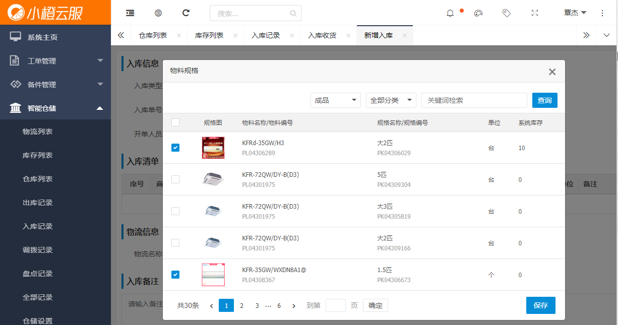 第一步:入库记录列表。在左侧菜单【智能仓储】-【入库记录】,点击进入入库列表。